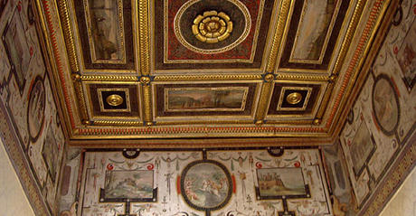 Sul ricco soffitto ligneo cinquecentesco si alternano paesaggi dipinti e rosoni intagliati e dorati.