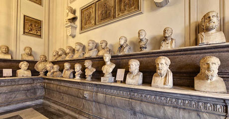 La disposizione della raccolta dei ritratti di filosofi e letterati greci e romani, tanto amati dai romani per la decorazione di edifici pubblici e privati, ripropone quella della Sala degli Imperatori.