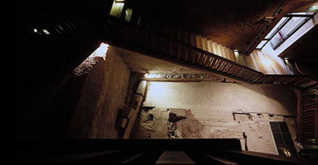 Dalla galleria un'apertura immette in un vano di fondazione formato dalle possenti strutture murarie di sostegno del piano superiore del Tabularium.
